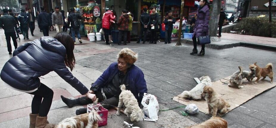 2015年1月20日,贵州省贵阳市,一位7旬老人胸挂“流浪狗要饭团”的纸牌,与一群宠物狗在街头乞讨,地上还写有文字呼吁大家爱护流浪狗,许多市民见状解囊施舍,老人连忙双手合十感谢道“好人一生平安”。时值中午,老人躺在地上睡觉,一只小狗趴在老人的肚子上取暖。与老人“同行”的狗大都是遭抛弃的宠物狗,它们在老人身边自由自在地玩耍,也不会跑远,老人见有市民拍照,并不反对,还十分配合,因此也获得一些施舍。老人说,他76岁,但名谁姓氏一字未透露。他与流浪狗每天都在大十字、喷水池、紫林奄、老客车站等地段乞讨,乞讨所得,全部作为自己和这些流浪狗的生活费。