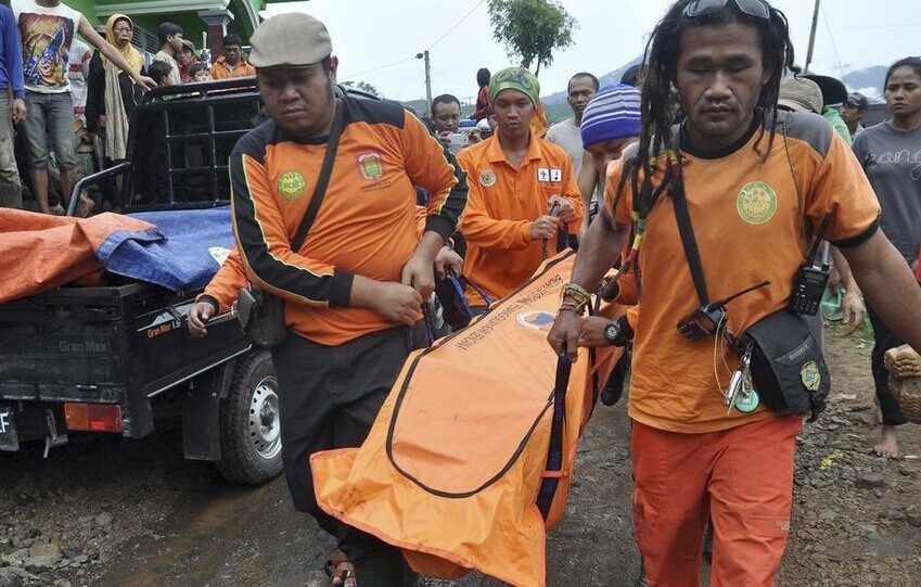 大约200名由军人和警察组成的救援团队以及大约500名志愿者参与救援工作。他们使用铲子、锄头和双手在房屋废墟以及泥地中挖掘,寻找幸存者。 印尼国家抗灾署发言人苏托波说,15人获救,其中11人伤势严重,正在医院接受治疗。423名村民以及周边地区居民被转移至多处临时避难所。图为12月13日,在印度尼西亚中爪哇省山体滑坡事故现场,搜寻与救援队伍抬运遇难者尸体。