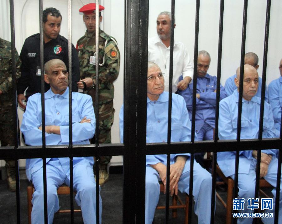 11月16日,在利比亚首都的黎波里哈德巴监狱,多名卡扎菲时期高官出庭。利比亚法庭16日再次开庭审理卡扎菲政权高官,31名前高官出庭受审,卡扎菲次子赛义夫和三子萨阿迪当天没有出庭。新华社发(哈姆扎·图尔基亚摄)