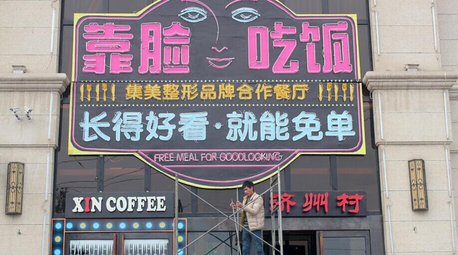 近日,郑州一餐厅因高调打出“靠脸吃饭”招牌,整形专家现场对就餐顾客容貌打分,颜值高的顾客可免费就餐活动而走火。然而,1月13日下午,该餐厅约30平方米的“靠脸吃饭”广告牌被市城管局责令自行拆除。郑州市城市管理局下发的责令改正通知书中显示,该餐厅未经批准,擅自设置户外广告行为,违反《郑州市户外广告设置管理条例》第12条规定,有碍市容容貌。不过,餐厅薛经理表示,“脸庞”虽被摘除,但“刷脸”活动将依旧进行。图为餐厅“靠脸吃饭”虽被拆除,但仍有市民慕名前来测颜值。