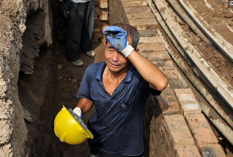 8月5日,今年59岁的河南驻马店人杨中西在山西太原一处工地工作间隙擦汗